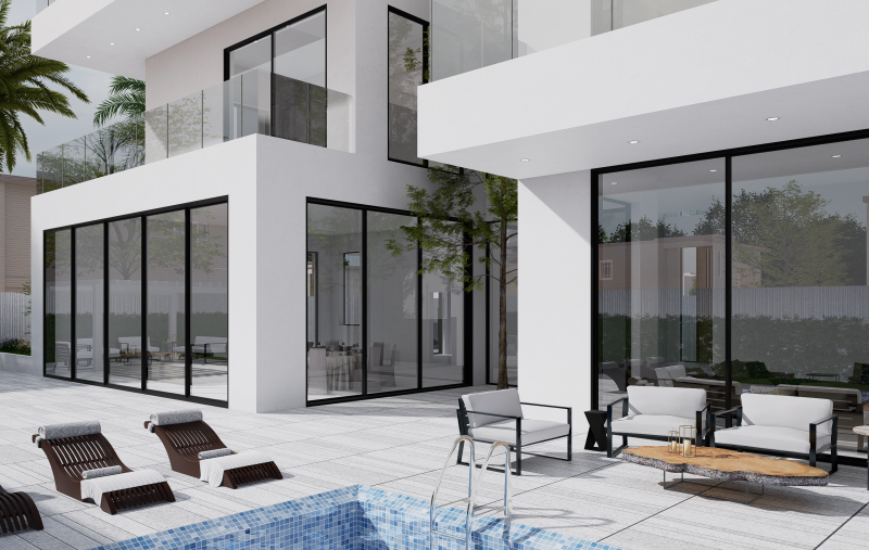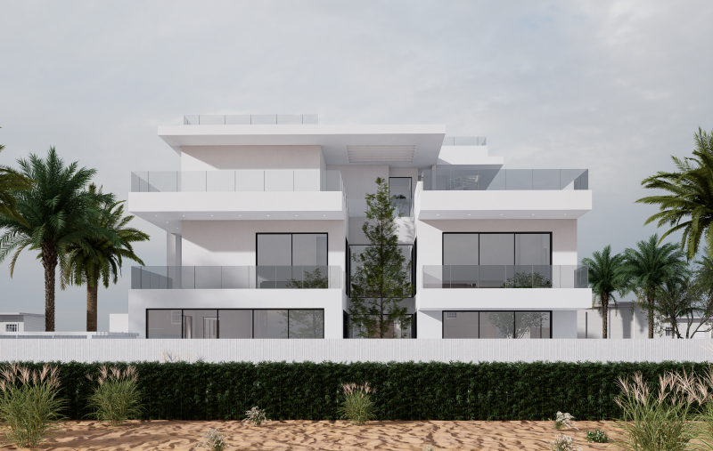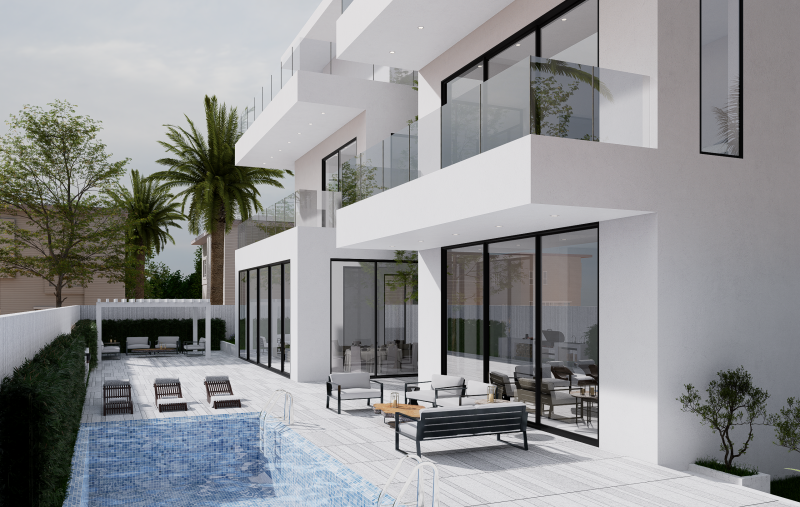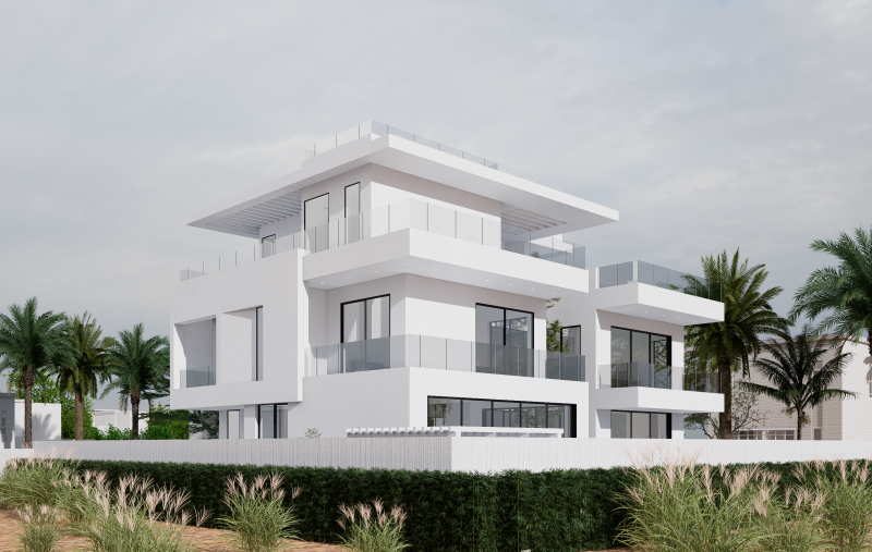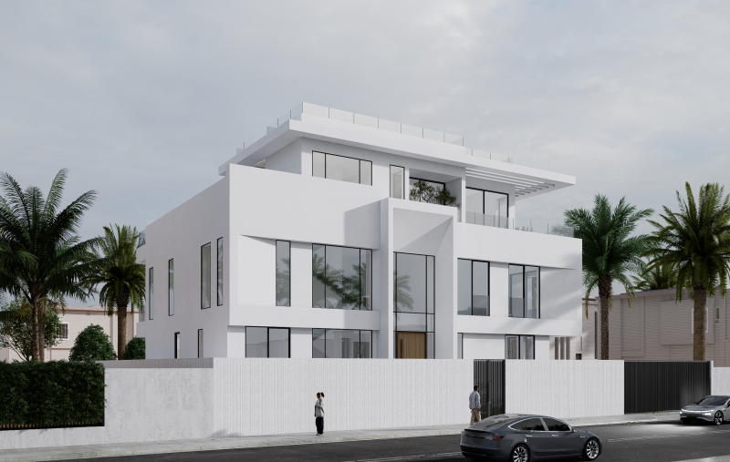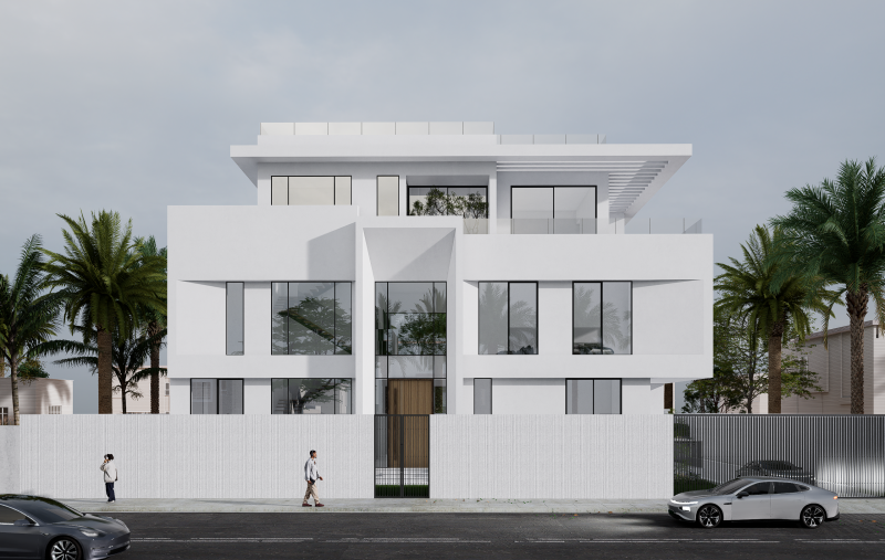 A prominent vertical entry element anchors the design, while cantilevered terraces and a sleek pergola add depth and contrast. Finished in crisp white stucco with warm wood accents and integrated greenery, the villa achieves a serene yet striking architectural presence—offering refined modern living in a tranquil setting.