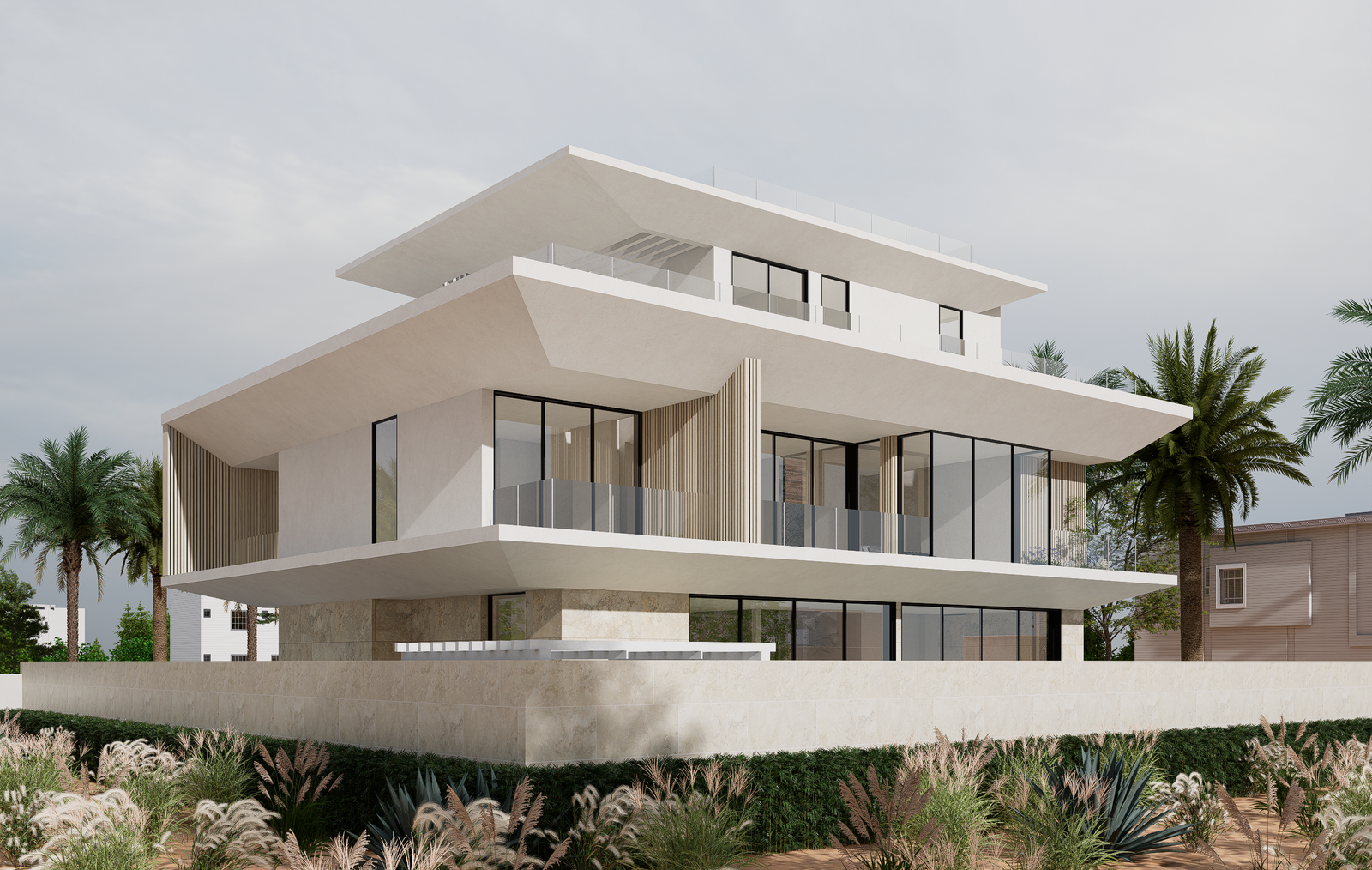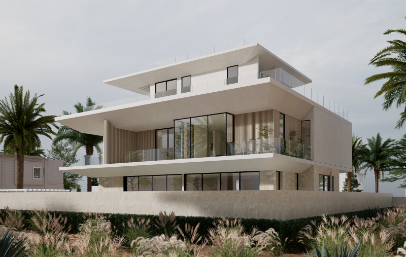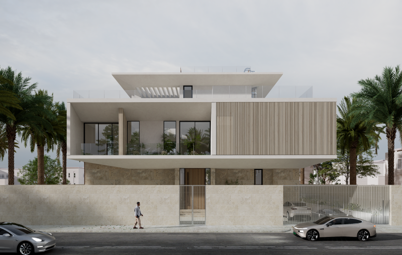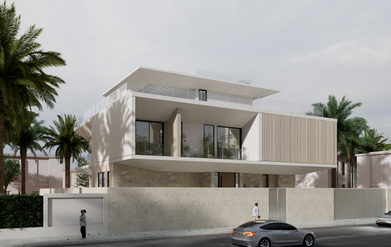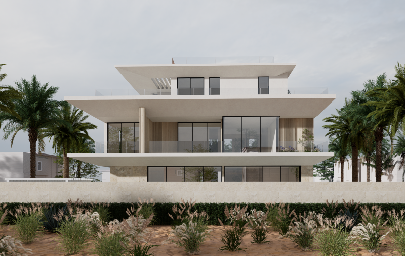This villa is conceived in a contemporary modern style, defined by strong horizontal volumes, deep cantilevered slabs, and clean geometric lines that create a striking yet balanced architectural composition. The design emphasizes openness through expansive floor-to-ceiling glazing, blurring the boundary between interior and exterior while ensuring abundant natural light and panoramic views. Vertical fins and textured cladding introduce rhythm and contrast to the otherwise horizontal expression, while a restrained palette of stone, glass, and light-toned finishes conveys elegance and harmony with the natural environment. The interplay of solid stone at the base and floating upper levels enhances the sense of lightness, complemented by multiple terraces and balconies that extend living spaces outward and embrace the surrounding landscape. Minimalist detailing and a focus on proportion complete the villa’s refined architectural identity, making it a contemporary landmark rooted in both function and aesthetics.