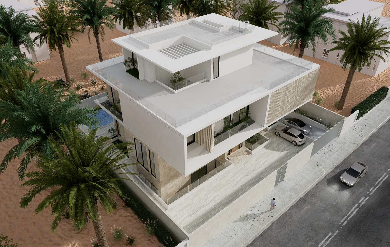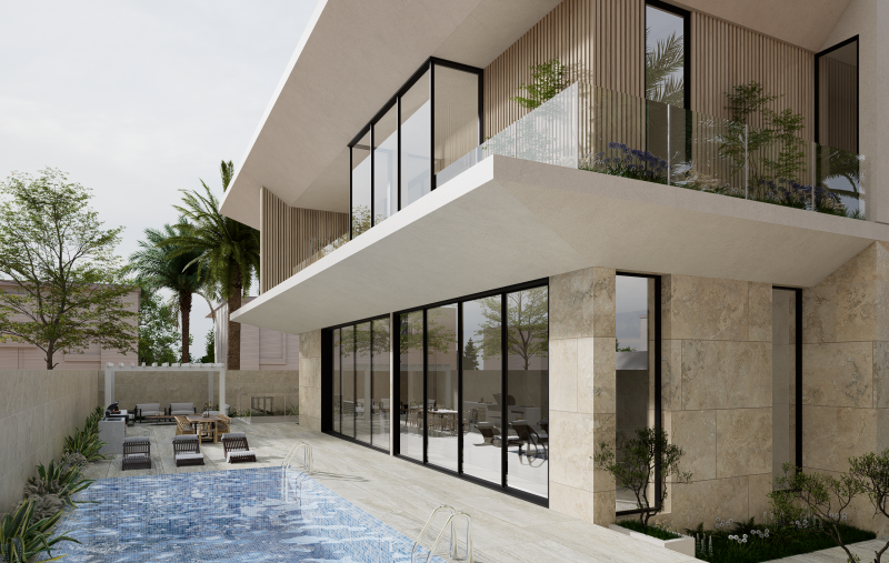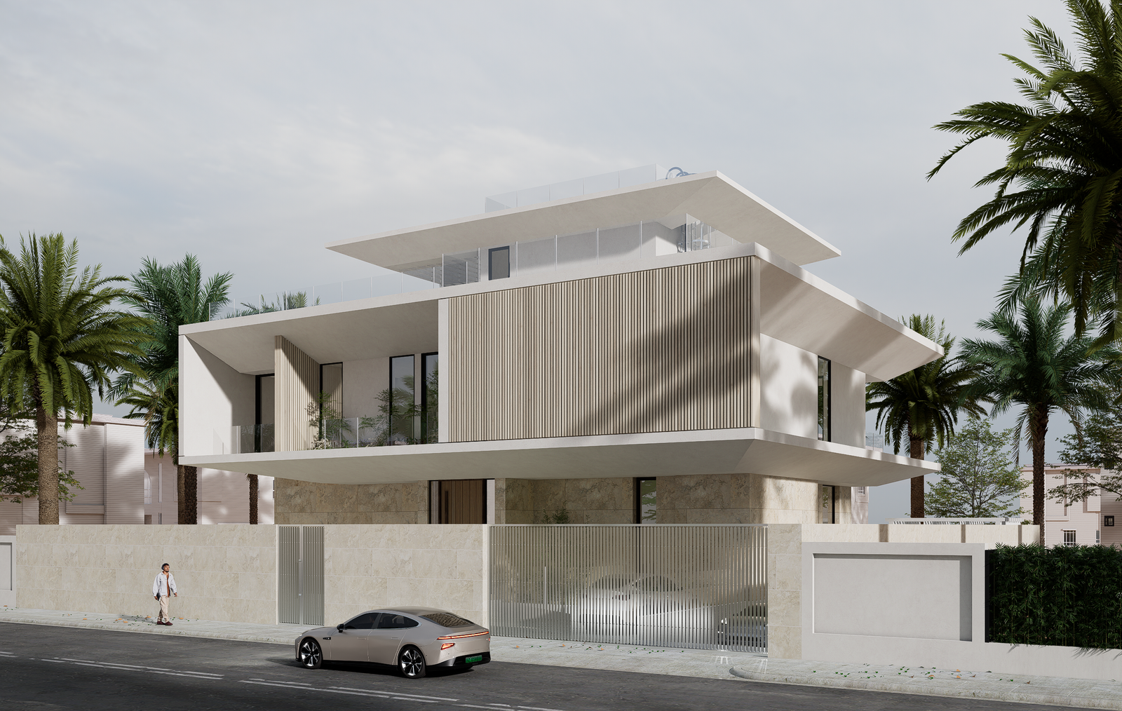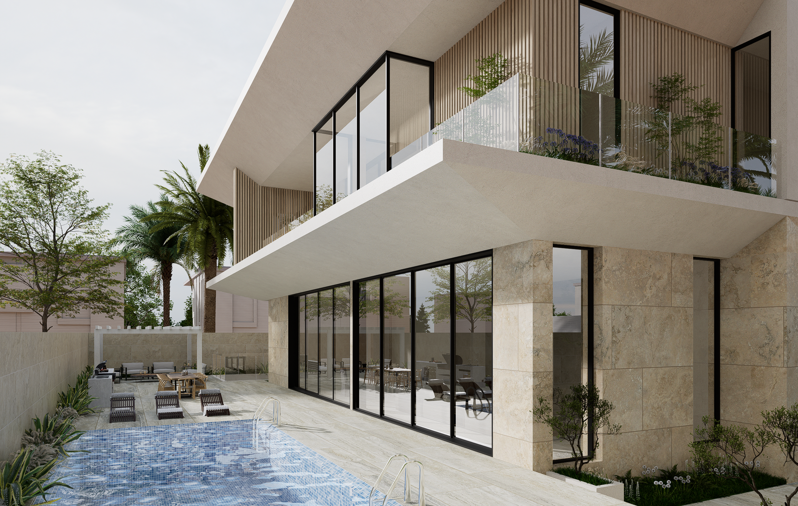 This villa is conceived in a contemporary modern style, defined by strong horizontal volumes, deep cantilevered slabs, and clean geometric lines that create a striking yet balanced architectural composition. The design emphasizes openness through expansive floor-to-ceiling glazing, blurring the boundary between interior and exterior while ensuring abundant natural light and panoramic views. Vertical fins and textured cladding introduce rhythm and contrast to the otherwise horizontal expression, while a restrained palette of stone, glass, and light-toned finishes conveys elegance and harmony with the natural environment. The interplay of solid stone at the base and floating upper levels enhances the sense of lightness, complemented by multiple terraces and balconies that extend living spaces outward and embrace the surrounding landscape. Minimalist detailing and a focus on proportion complete the villa’s refined architectural identity, making it a contemporary landmark rooted in both function and aesthetics.