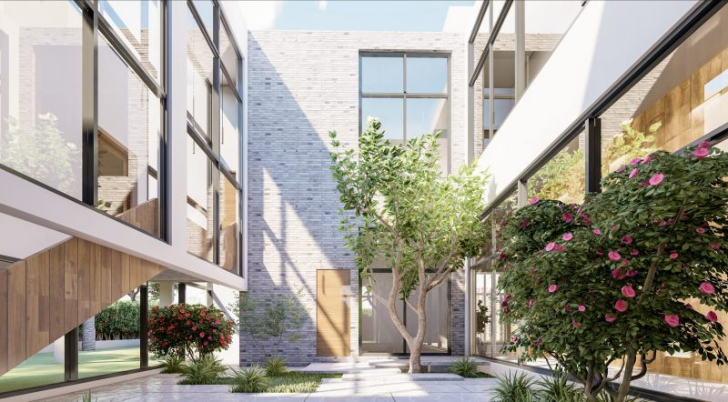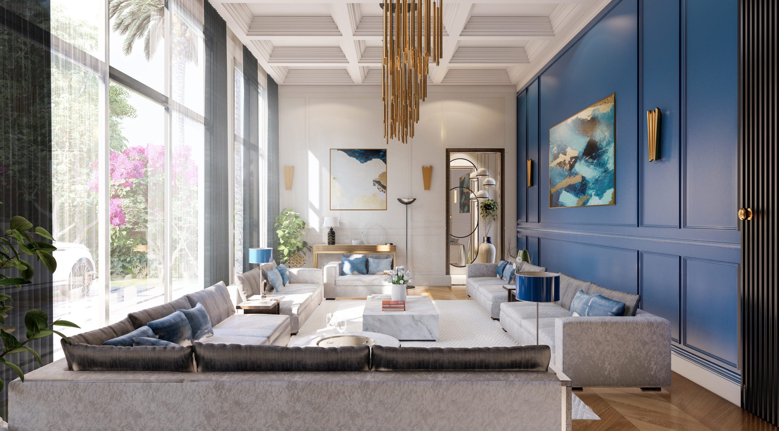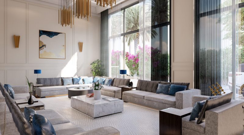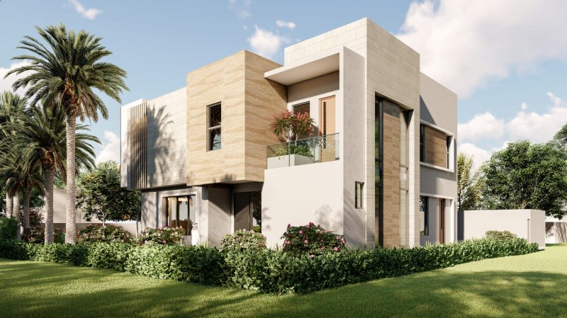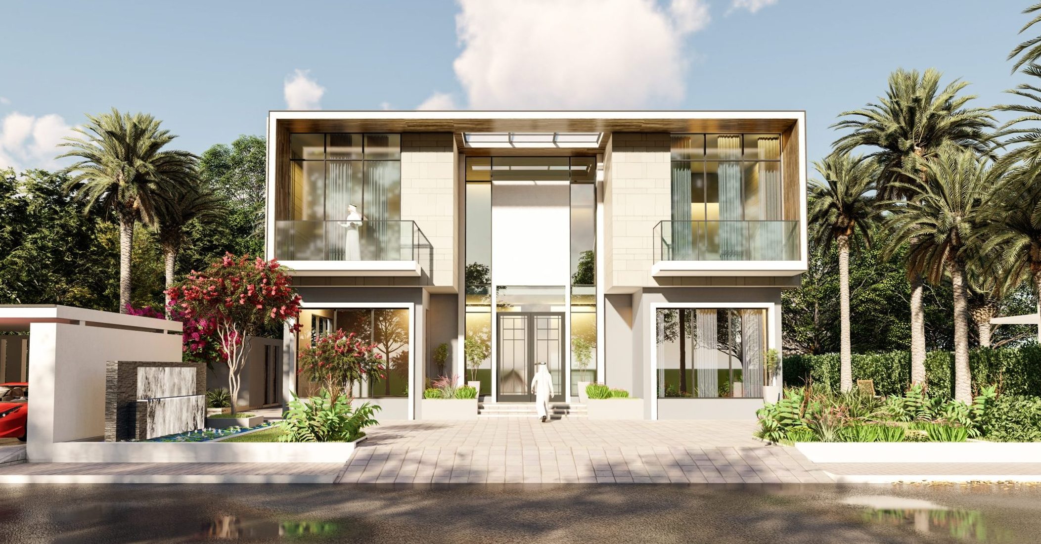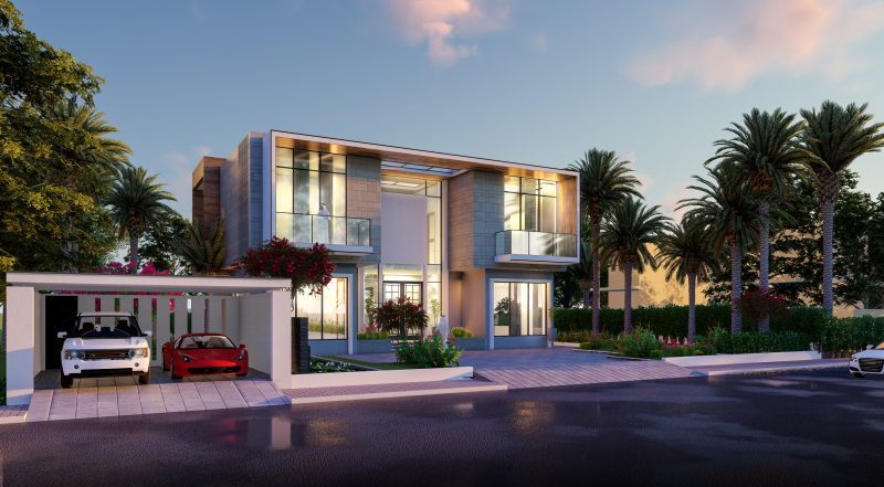 Floating balconies with frameless glass railings and a dramatic double-height entrance enhance the sense of openness and grandeur. Flat rooflines and integrated lighting further emphasize the villa’s modernist design language, offering a seamless blend of form and function.