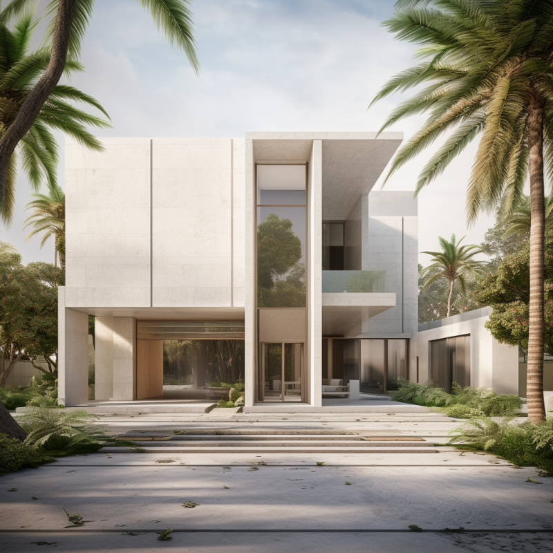 The villa’s architectural design embraces a modern minimalist aesthetic, characterized by clean cubic volumes, a balanced composition, and a refined material palette. The use of smooth concrete or light-toned stone, complemented by warm wooden accents and expansive glass elements, creates a sleek yet inviting facade. A cantilevered upper volume adds visual interest while maintaining the simplicity of the form. Floor-to-ceiling windows and transparent railings enhance the connection between indoor and outdoor spaces, while understated landscaping and broad concrete steps emphasize a calm, contemporary approach. The overall design reflects the client’s preference for simplicity, elegance, and modern living.