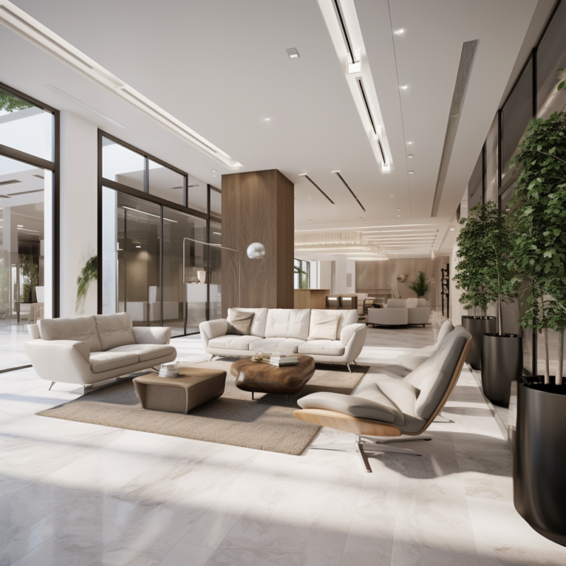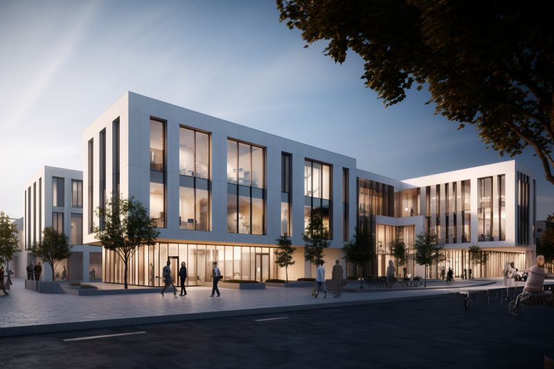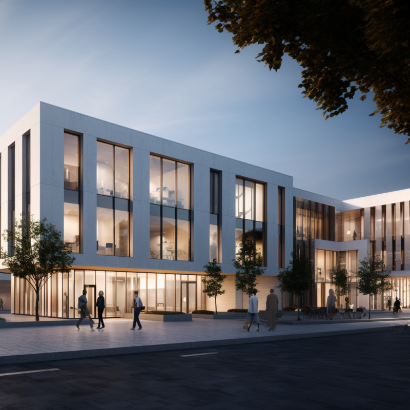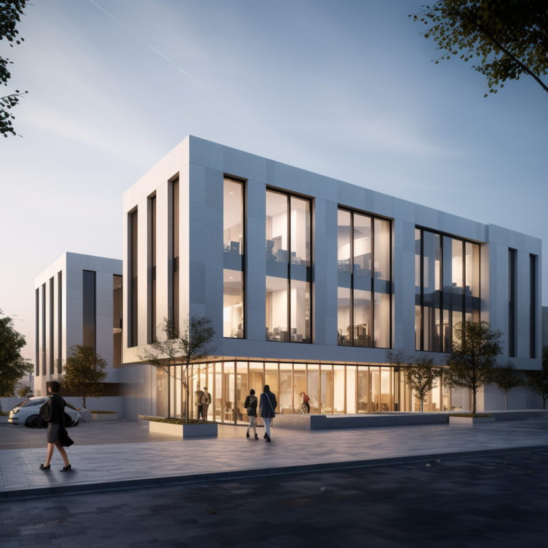 With a palette of white stucco and sleek aluminum accents, the building expresses a sense of clarity and contemporary elegance, offering a functional yet visually striking presence within the urban context.